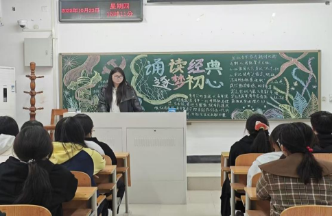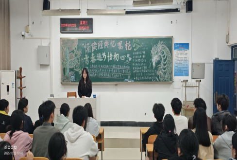团课期间,团支书带领同学们共同诵读了经典诗文,重温了习近平总书记与大学生亲切交流的温暖场景。从2014年五四青年节习近平总书记来到北京大学,称赞师生朗诵《沁园春·长沙》时展现出的文化自信,到2020年9月在湖南大学,总书记勉励学生“不负青春、珍惜时光,好好学习,掌握知识本领”——一句句深情嘱托,如春风化雨,浸润着每一位在场学子的心灵。
