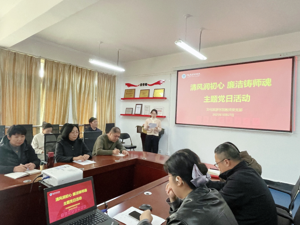 为深入推进党风廉政建设,筑牢教师党员廉洁从教思想根基,10 月 27 日下午,文化旅游学院教师党支部以“清风润初心 廉洁铸师魂”主题,组织开展支部演讲活动。活动由教师党支部书记付红丹主持,教师党员参与。