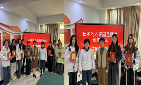11月10日,学院心理工作站站长田嘉副书记与副站长范宁怡老师为心理情景剧大赛及“秋冬的心事”园艺贴画活动的获奖同学颁发奖状,标志着本届心理健康宣传月活动顺利收官。