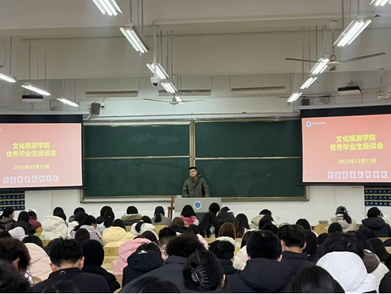 随后,“校友大讲堂”在明理楼1201开讲,吸引了众多文化旅游学院在校生踊跃参与。周金勇、杨广昊校友分别以“文旅融合趋势下的职业成长路径”和“从校园到职场:文旅人的匠心与担当”为主题,结合自身职业发展历程和行业典型案例,分享了文旅行业的最新动态、核心能力要求以及职业生涯规划心得。他们勉励学弟学妹们要扎实掌握专业知识,积极投身实践,培养创新思维和工匠精神,在文旅行业广阔天地中实现人生价值。