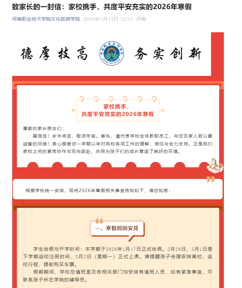 通过致家长一封信、家长联络群等方式,向学生家长通报涉校诈骗形势,提示寒假期间学生可能面临的网络风险,呼吁家长共同关注学生动态,加强沟通引导,形成家校协同防范合力,尤其在学生实习实践、兼职打工、网络社交等方面给予必要提醒和指导。